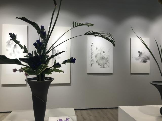 展览作品位于银都锦创广场一楼中庭,陈国欢的绘画与朱德玲的书法相间陈列,在展陈上主办方并没有将二位艺术家的作品分成独立单元,二是将书法与绘画融合在一起进行展示,似乎暗合中国画论中的“书画同源”一说。