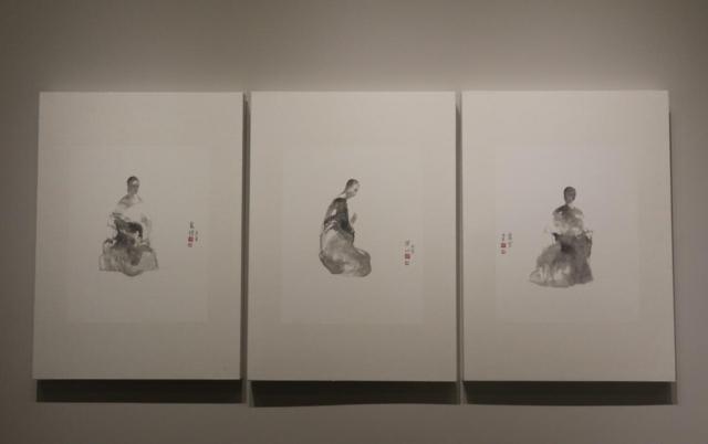 陈国欢老师很少画人物,但是在这次展览中,有三幅人物绘画让人眼前一亮。画中是三个僧人,人的外形非常简单,但内在却很丰富。这三幅禅画借人物,表现禅家渐悟的过程。